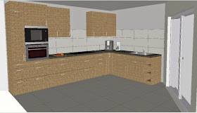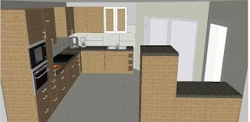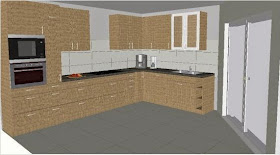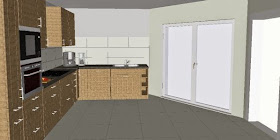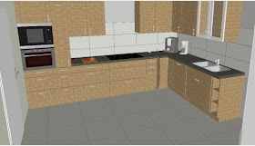 Ich bin zwar kein Küchenplaner, aber mithilfe des Internets konnte ich - bis auf fünf kleine Fehler - fast alles darstellen. So ähnlich könnte unsere Küche später aussehen - rechts neben der Tür würde allerdings unser freistehender Kühlschrank sowie unser Bartisch stehen und nicht, wie hier abgebildet, die Küchenschränke. Außerdem ist die ganz rechte Seite auch noch nicht richtig - das soll eigentlich unten und oben abgeschrägt sein: