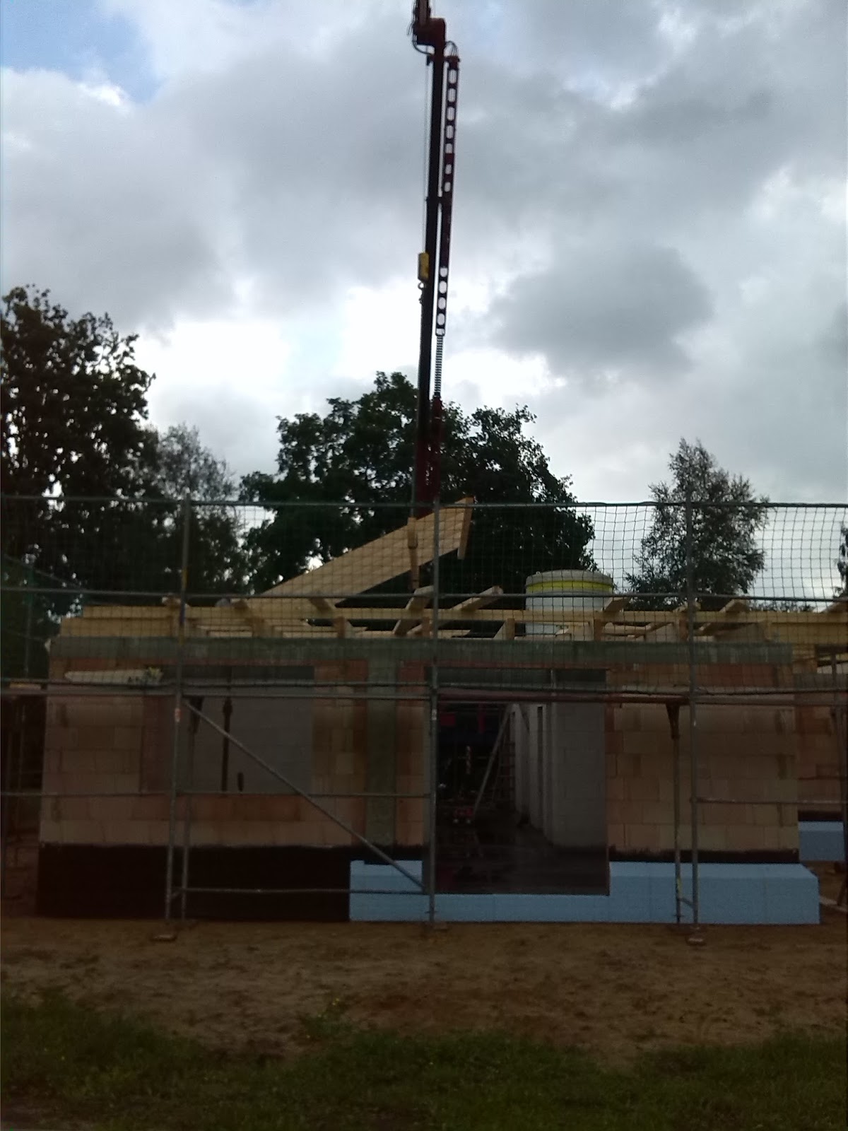 Seit dem letzten Beitrag wurde das Gerüst aufgebaut, die Zimmerleute haben mit dem Dach begonnen und die Maurer haben sich bereits um den Verblender gekümmert! Sehr schön, nun ist es fast ein vollständiges Haus.