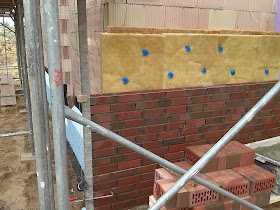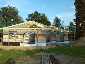 Seit dem letzten Beitrag wurde das Gerüst aufgebaut, die Zimmerleute haben mit dem Dach begonnen und die Maurer haben sich bereits um den Verblender gekümmert! Sehr schön, nun ist es fast ein vollständiges Haus.
