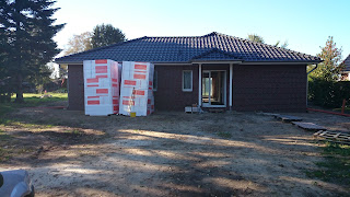 Seit dem letzten Post sind doch wieder einige Dinge vorangeschritten. Außen wurde das Haus fertig verfugt - nur die Dehnungsfugen fehlen noch. Außerdem wurden die Kernbohrungen für die Entlüftungsanlage vorgenommen. Im Innenbereich waren die Trockenbauer am Werkeln und haben die Decke fast komplett geschlossen. Vorm Haus steht auch schon die Dämmung für den Estrich und wartet auf seinen Einsatz. Das wird wohl aber noch etwas dauern. Auf jeden Fall wächst unser kleines Haus Woche um Woche :).